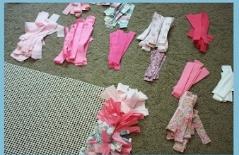 Хочу Вас сразу предупредить, что создание этого коврика заняло у меня достаточно много времени. Но учитывая то, что эта работа не требует больших усилий и концентрации внимания, сделать коврик достаточно просто. К примеру, я одновременно смотрела телевизор или слушала аудиокниги. Вы тоже можете совместить свой отдых с такой лёгкой работой. Итак, для начала нужно подготовить необходимые инструменты и материалы. Возьмите мягкие ткани разных цветов, в моём случае это были розовые и голубые, и нарежьте их полосками 10 см на 3 см. У меня на этот коврик ушло около 1000 полос. Но не пугайтесь, его действительно очень просто сделать.